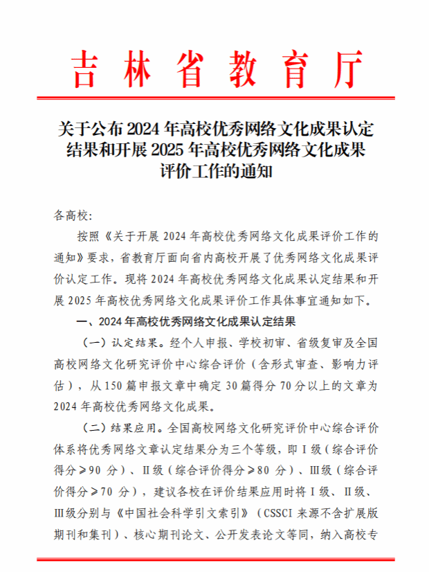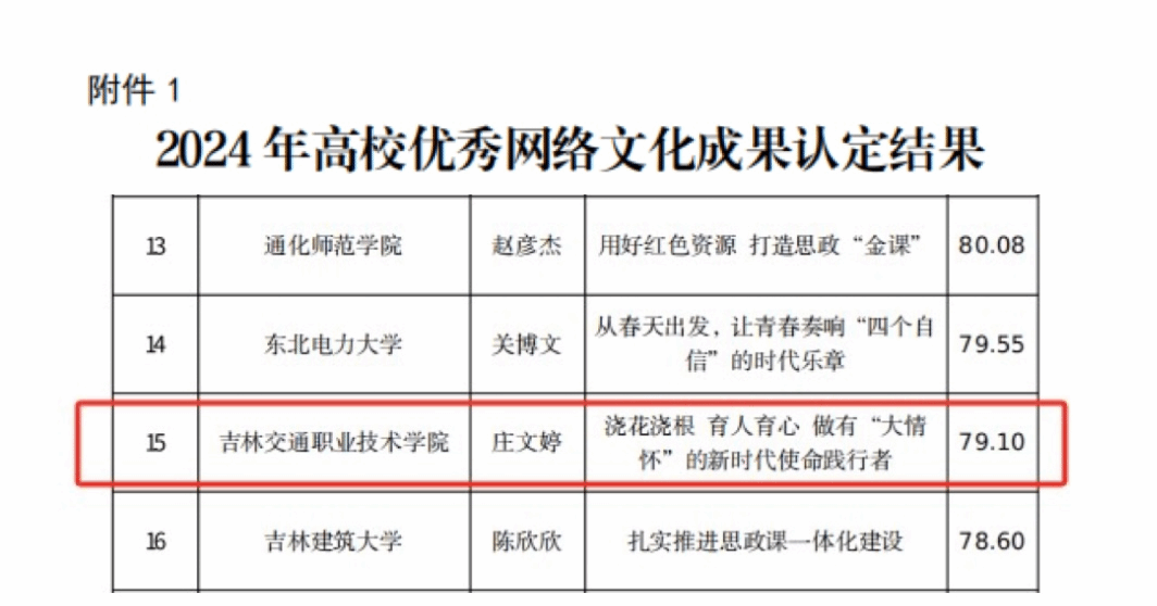 近日,吉林省教育厅公布了《2024年高校优秀网络文化成果认定结果和开展2025年高校优秀网络文化成果评价工作的通知》,我校教师庄文婷的《浇花浇根 育人育心 做有“大情怀”的新时代使命践行者》被认定为2024年高校优秀网络文化成果。